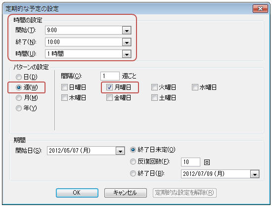 毎週月曜日の開始時刻と終了時刻を指定して「OK」をクリック