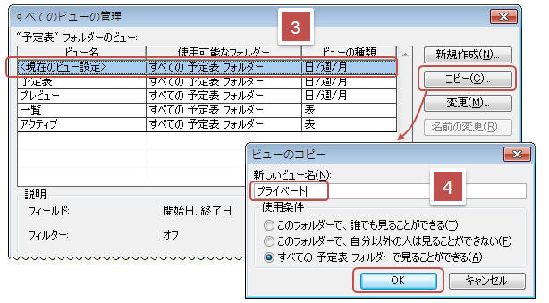 <現在のビュー設定> が選択されていることを確認し「コピー」をクリック