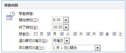 Outlookの「稼働日」表示形式ではデフォルトで月曜日〜金曜日の8:00〜18:00が表示されます。日時を変更するには次の通り操作します。