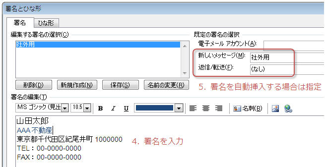 署名は複数作成できます。例えば「社内用」「社外用」の署名を作成しておき、送信する相手によって使い分けます。
