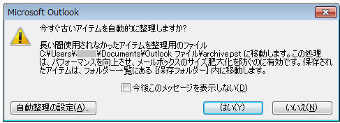 ▼ 古いアイテムを整理(移動)する際、既定では下記のメッセージが表示されます。