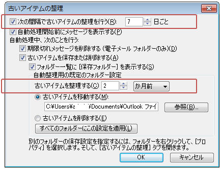 「次の間隔で古いアイテムの整理を行う」のチェックをON(開始)OFF(停止)する