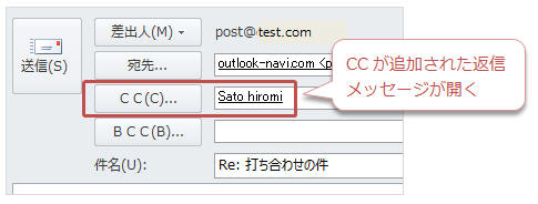 受信メッセージを開いて(又は選択して)このボタンをクリックすると、CCにアドレスが追加された返信メッセージが開きます。