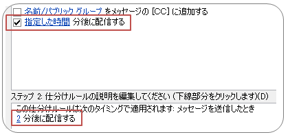 「指定した時間分後に配信する」にチェックを入れ、下のボックスで○分を指定