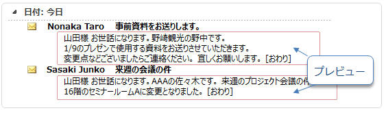 Outlookで「プレビュー」ビューにすると未読のメールのみ内容(プレビュー)がフォルダ一覧に表示されます。