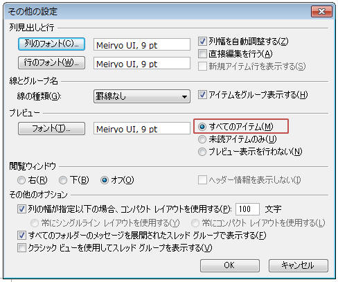 「表示」タブ−「ビューの設定」をクリック 「その他の設定」をクリック 「プレビュー」枠で「すべてのアイテム」をONにし「OK」−「OK」をクリック