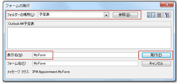 「参照」をクリックし「フォルダ―の場所」を予定表とする。「表示名」を入力したら「発行」をクリック