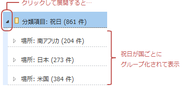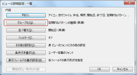 「ビューの設定」ボタンをクリックし、「グループ化」をクリック