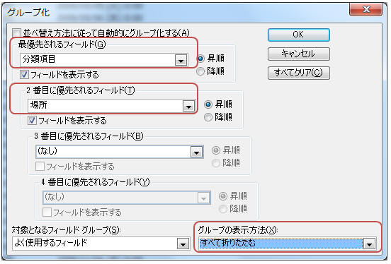 「最優先されるフィールド」=「分類項目」、「2番目に優先されるフィールド」=「場所」とする