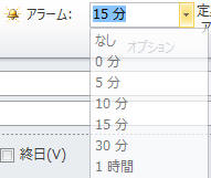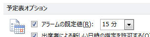 ★アラームのデフォルト値は「ファイル」タブ−「オプション」−「予定表」にある「予定表オプション」の「アラームの既定値」で設定できます。