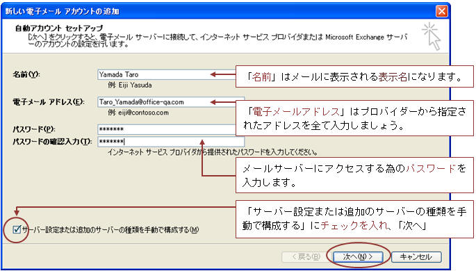 「新しい電子メールアカウントの追加」ダイアログで下記のように入力します