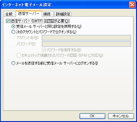 「送信サーバー」タブで「送信サーバー(SMTP)は認証が必要」にチェックが必要な場合もあります。 プロバイダーからの情報を確認しましょう。
