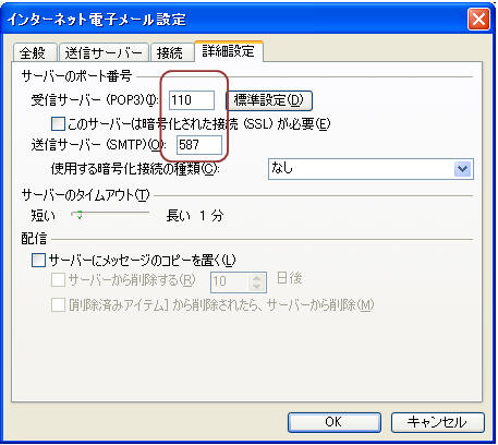 「詳細設定」タブでポート番号の変更が必要な場合があります。プロバイダーからの情報を確認しましょう。 (ポート番号が異なると送受信エラーになるので注意が必要です。)