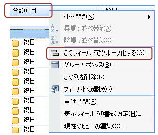 予定表を開き、「表示」−「現在のビュー」−「分類項目別」をクリック