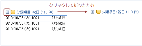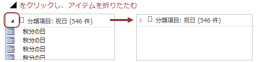 「分類項目:祝日(XXX件)」左の「−」をクリックし、祝日アイテムを折りたたむ(既に折りたたまれている場合はそのまま)