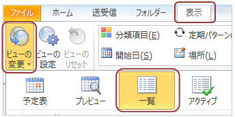 予定表を開き、【表示】タブ−「ビューの変更▼」−「一覧」をクリック