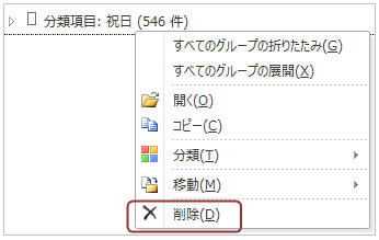 「+」マークをクリックして展開します。1番最初の祝日アイテムをクリックし、SHIFTキーを押しながら最後の祝日アイテムをクリックします。祝日が全選択されたら右クリックして「削除」をクリックします。 |