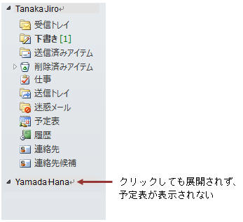 というエラーが表示され、ナビゲーションウィンドウ(フォルダ一覧)で共有予定表を見ることができない。