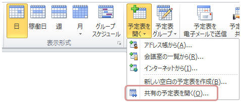 予定表を表示し、【ホーム】タブ−「予定表を開く▼」−「共有の予定表を開く」をクリック(又はアドレス帳から)