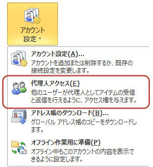 メールボックス所有者のOutlookを起動し、「ファイル」タブ−「アカウント設定▼」−「代理人アクセス」をクリック