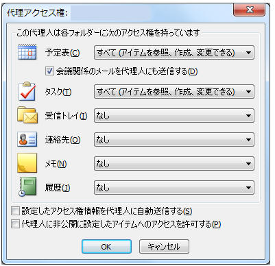 代理アクセスダイアログでフォルダ(受信トレイ、予定表、連絡先、仕事、メモ、履歴)のアクセス権を設定