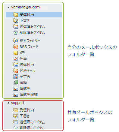 ★補足:この方法は、通常メールボックスの所有者が許可したフォルダのみが表示される共有方法ですが、管理者から「フルメールボックスアクセス」を許可されている場合は、全フォルダが表示されます。