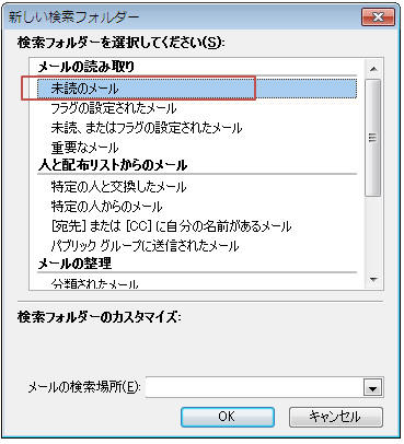 「未読のメール」が選択されている状態で「OK」をクリック