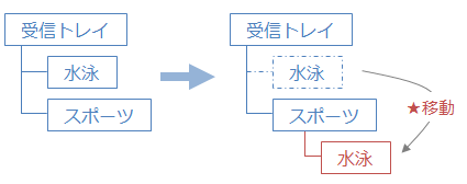 Set MyInbox = Application.GetNameSpace("mapi").GetDefaultFolder(6) Set Swim = MyInbox.Folders("水泳") Set Sports = MyInbox.Folders("スポーツ") Swim.Moveto Sports ★受信トレイを取得 ★水泳フォルダを取得 ★スポーツフォルダを取得 ★水泳フォルダをスポーツフォルダ配下に移動