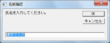 UserN = InputBox ("氏名を入力してください。","名前確認","漢字で入力")